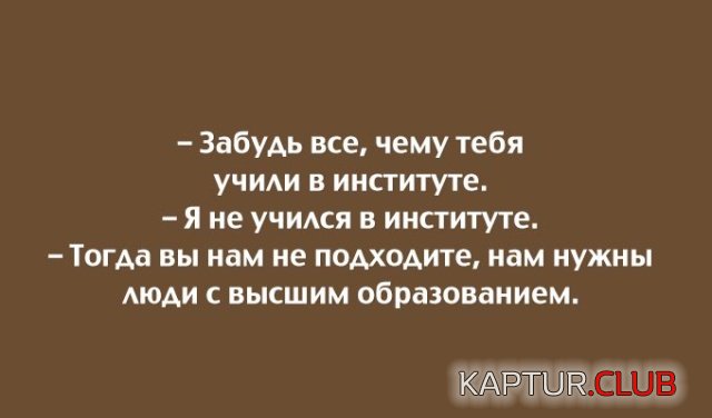 Частный предприниматель Владимир Шебзухов -- Всё, всё скорее позабудьте, Чему учили в институте! -- Я в институте не учился. Своим умом всего добился. Тогда принять не можем мы. Другого вместо вас подыщем. Работники ведь нам нужны, С образованьем – только высшим!